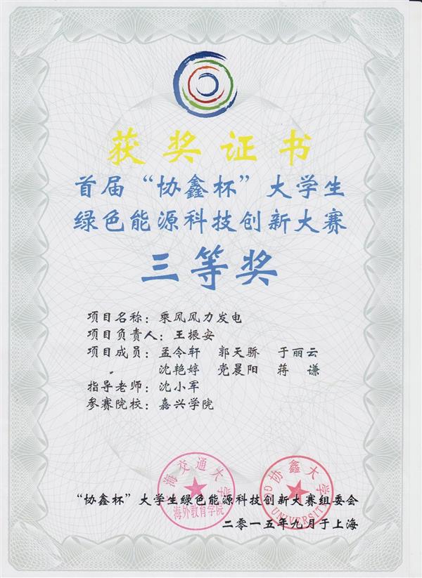 2015年9月,協鑫杯獲獎