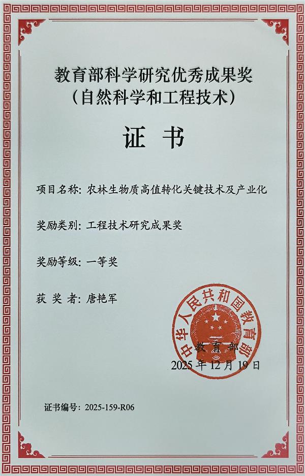 近日,根據教育部發布通知,浙江理工大學作為第二完成單位、唐艷軍教授作為主要完成人的科技成果“農林生物質高值轉化關鍵技術及產業化”獲2025年教育部科學研究優秀成果獎一等獎。
