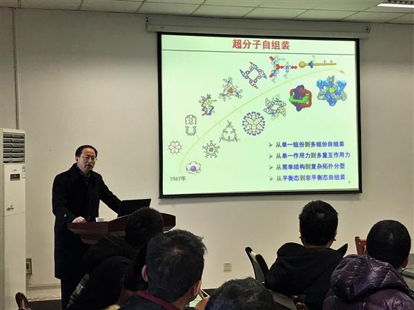 楊海波教授在理學院383會議室為全院師生做了題為“通過逐級自組裝構筑功能化超分子組裝體系”的學術報告。理學院應用化學系張廣成教授、顏紅俠教授、劉郁楊教授、閆毅教授等老師參加了本次報告會。楊海波教授的報告引起了在場師生的廣泛興趣,大家都積極與他交流與討論。