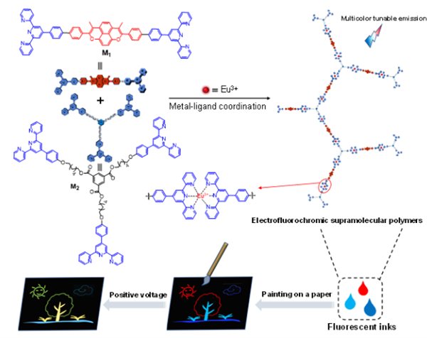 熒光超分子聚合物由于其在傳感器、探針、有機電子器件、顯像劑等領域具有巨大的應用潛力而成為熒光材料領域中冉冉升起的新星。但是,由于可選擇的電致變色基元的缺乏,具有電致變色特性的熒光超分子聚合物很少被報道。近日課題組通過三聯吡啶配體與Eu3+離子的配位作用成功地構建了一種新型的1,8-氧雜芘基的電致熒光變色超分子超支化聚合物(EFSPs)。所得到的聚合物具有熒光的多色可調性能和優異的電致熒光變色特性,并可用作防偽油墨。首先課題組設計并合成了兩種單體M1(三聯吡啶配體偶聯于1,8-氧雜芘的2-和7-位)和M2(三聯吡啶配體通過柔性鏈連接于苯環的1-, 3-, 5-位),然后通過雙單體法將M1和M2與Eu3+進行離子配位即可制備出EFSPs。通過改變M1和M2的比例,可以調控EFSPs的熒光顏色從藍色到紅色的轉變,并且經過白色熒光區域。當在正負電壓的刺激下,由于1,8-氧雜芘基元可發生氧化還原反應,導致EFSPs的熒光顏色發生改變。基于EFSPs的電致熒光變色特性,課題組將其作為防偽油墨,在紙上制備出一幅多色的防偽圖案。在通電作用下,防偽圖案的熒光顏色發生轉變,這為熒光防偽領域提供了一種全新的解決思路。