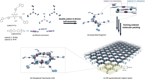 陽離子-π相互作用是源于生命體中的一種陽離子與極化的π電子云之間的吸引力,被認為是目前最強的非共價鍵作用力之一。陽離子-π相互作用在生物醫學、化學以及材料科學等多個領域發揮了重要作用。一般來講,為了形成陽離子-π相互作用,包含陽離子基團的分子平面和包含芳香結構的分子平面通常是相交的,然而,形成二維超分子組裝體需要所有的構筑基元都要重復排列在兩個正交的維度上,因此很難利用具有高強度鍵合特征的陽離子-π相互作用制備穩定的二維超分子材料。
