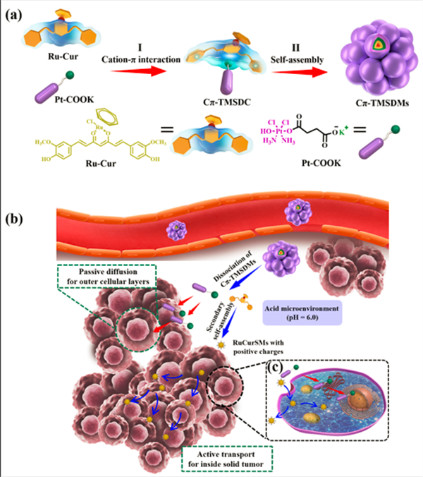 腫瘤特殊的微環境如致密的細胞外基質、較高的間質壓和高的細胞堆積密度等致使藥物很難滲透到腫瘤組織內部,導致腫瘤組織內層部位藥物濃度不足,無法徹底根除全部腫瘤細胞。雖然基于濃度驅動的被動擴散和基于轉胞吞作用的主動滲透在一定程度解決了上述問題,但任何單一的治療策略都不可避免地存在一定的缺陷。基于此,本課題組通過利用陽離子-π的橋連作用構建出一種集被動擴散和主動滲透機制于一體的三金屬超分子藥物復合物(Cπ-TMSDC) (圖1a),該復合物是通過兩種藥物單體間的陽離子-π作用形成。所得的Cπ-TMSDC可以進一步自組裝成基于陽離子-π的三金屬超分子藥物膠束(Cπ-TMSDM)。由于腫瘤組織的酸性微環境,Cπ-TMSDM中陽離子-π作用首先解離,促進Pt-COOK的快速釋放;在濃度梯度驅動的被動擴散影響下,實現順鉑藥物在腫瘤組織外層細胞的快速浸潤(圖1b)。與此同時,釋放的Ru-Cur發生二次自組裝,生成帶有正電荷的小膠束,通過誘導陽離子激活的轉胞吞作用,實現對內層實體腫瘤的主動滲透(圖1b)。以上策略實現了超分子藥物自遞送體系對腫瘤深層的有效滲透,達到了高效腫瘤治療的目的。