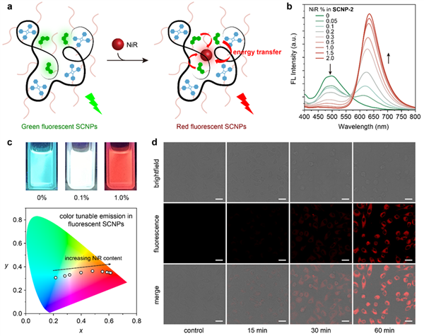 此外,通過將尼羅紅染料封裝并結合鏈內能量轉移機制,我們成功實現了對所得SCNP熒光特性的精細調控。這一策略不僅顯著擴展了熒光發射的可調性范圍,使其能夠產生從綠色到紅色的寬譜發射,還包括了白光發射,從而大大增強了該材料在生物成像等領域的應用潛力。