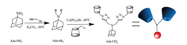 Tuning the morphology of supramolecular hyperbranched polymers (SHPs) in solution has theoretical and practical significance in SHP applications. This study successfully achieved SHP morphology transitions from branched supramolecular structures to spherical nanosized micelles in mixed solvents. Transmission electron microscopy, dynamic light scattering, 2D 1H NMR ROESY, and fluorescence emission spectroscopy confirmed these transitions. An AB2-type amphiphilic β-cyclodextrin (β-CD) monomer (Ada-CD2) exhibiting double supramolecular interactions was initially synthesized. SHPs based on Ada-CD2 were then formed in DMF–H2O mixed solvents through the host–guest inclusion interaction between β-CD and Ada. The formed SHPs disassembled with the addition of adamantane carboxylic sodium salt, which was a competitive guest. The SHPs reassembled into core–shell structured micelles based on the hydrophilic–hydrophobic interaction of the amphiphilic Ada-CD2 monomer.