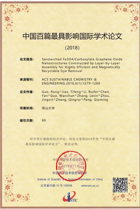 【新聞中心訊】11月19日,中國科學技術信息研究所(以下簡稱“中信所”)在北京召開中國科技論文統計結果發布會,我校環境與化學工程學院焦體峰教授團隊的研究成果(Sandwiched Fe3O4/carboxylate grapheneoxide nanostructures constructed by layer-by-layer assembly for highlyefficient and magnetically recyclable dye removal. ACS Sustainable Chem. Eng.,2018, 6, 1279-1288.)入選2018年中國百篇最具影響國際學術論文。