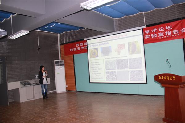 陜西省重點科技創新團隊第四屆學術論壇暨陜西省重點實驗室報告會于2014年11月22日在西安交通大學外文樓十樓會議室順利召開。論壇由理學院先進功能材料陜西省重點科技創新團隊主辦,陜西省先進功能材料及介觀物理重點實驗室支持,陳詠梅教授課題組承辦,論壇主題是“Biomaterials & Sensors”。本課題組研究生陳冰潔參加了此次交流會并作了題為“Microorganism inspired porous hydrogels: high adsorption, rapid swelling rate and high mechanical performance”的報告。