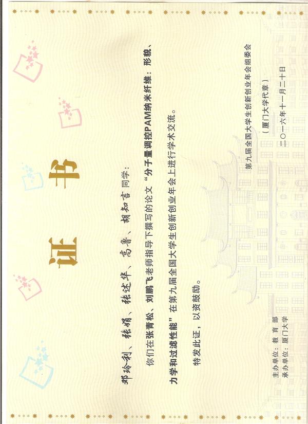 本課題組12級本科生鄧玲利等攜學術作品《分子量調控PAM納米纖維:形貌、力學和過濾性能》參加本次年會,并與19日下午參加項目的答辯工作,獲得第九屆全國大學生創新創業年會組委會頒發的證書。這是課題組繼10級本科生閆明洋、黃秀晶等攜創業項目《臥衛用凝膠制品的研制、開發和生產》參加第七屆全國大學生創新創業年會后再次參加,是課題組9年來堅持以科學研究和產業轉化為方向的具體成果體現,也是課題組在學?!氨究粕鷮熤啤?、“本科生招募計劃”、“大學生創新計劃”、“課外知識作品競賽”等多項活動指導下獲得的又一成果。課題組將進一步加大人才培養力度,積極鼓勵和支持優秀本科生提前進入課題組從事相關研究工作,提高本科生儀器操作、文獻報告、課題設計、數據分析、軟件使用等各方面能力。同時也歡迎各專業本科生加入本課題組。