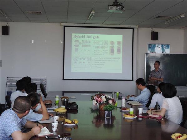 陳強副教授的報告以提高凝膠的力學性能為出發點,以構建凝膠內部的雙網絡結構為切入點,選擇合適的材料基體(瓊脂糖、聚丙烯酰胺),巧妙構建凝膠內部的雙網絡增強結構,采用磨具成型方法制備高強度凝膠材料,深入分析了雙網絡凝膠的力學增強機理,該生物質雜化高強度凝膠在人工韌帶、人工軟骨等方面具有諸多優勢性能,為新一代生物可移植材料開發提供技術支撐,并進一步拓寬了生物質雙網絡凝膠在骨移植、韌帶修復等方面的應用。