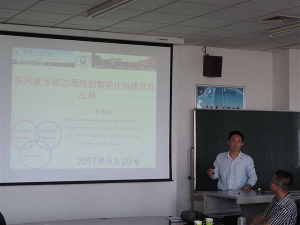 隨后,材料學院的趙孔銀副教授介紹了其課題組在海藻酸鈉基過濾膜方面的研究進展,其研究成果為過濾膜親水化改性提供了一條新穎的途徑。接著,張青松副教授作了題為“多尺度多模態凝膠的智能化構建及其應用”的報告,張青松副教授以凝膠的智能化構建為核心,以零維、一維、二維為不同尺度分別介紹了其課題組在光子晶體智能響應膜、生物發酵法制備多孔凝膠支架等方面的創新工作,引起了在座聽眾的極大興趣。最后,天津師范大學的白海會副教授和材料學院研二學生穆齊鋒分別就染料吸附凝膠膜和膠體靜電紡納米纖維作了相關匯報。