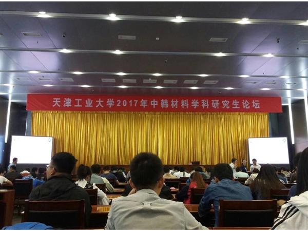 2017年9月29日“天津工業(yè)大學(xué)2017中韓材料學(xué)科研究生論壇”在天津工業(yè)大學(xué)學(xué)術(shù)交流中心隆重舉行。本次論壇由我校材料科學(xué)與工程學(xué)院趙永男教授主持,論壇設(shè)置了一個主會場和三個分會場,所有學(xué)術(shù)報告均用英文報告。參加此次論壇有來自韓國成均館大學(xué)、河南大學(xué)、陜西師范大學(xué)以及我校等國內(nèi)外高校材料學(xué)科的老師、博士和研究生100多人。本課題組15級碩士研究生穆齊峰和楊超超也參加了此次論壇,并希望可以通過這次機會與國內(nèi)外材料學(xué)科的研究生、博士生深入交流學(xué)習(xí)。