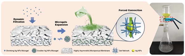 圖1 動態過濾法制備三維聚合物網絡穩定的納米銀催化膜及流體的限域流動示意圖