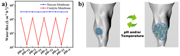 圖3 微凝膠固載催化膜的pH可逆響應(a)純水通量;(b)可逆形貌示意圖