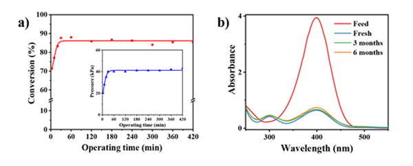 圖4 (a) 連續運行過程中4 - NP轉化率和阻力時間1.64s的跨膜壓力;(b) 新鮮制備的PES