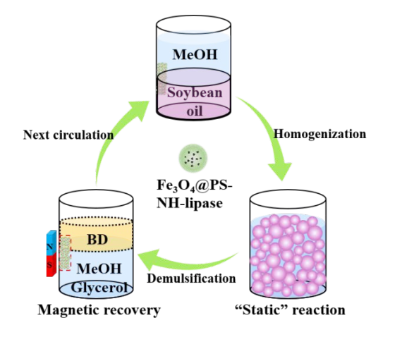 Green and efficient catalysts for the production of biodiesel are highly important. In this study, a Pickering magnetic interface biocatalyst (Fe3O4@PS-NH-lipase) was prepared, which can effectively stabilize the soybean oil-in-methanol emulsion and achieve static transesterification. Choosing the appropriate methanol/soybean oil molar ratio and catalyst loading, Pickering interface biocatalyst exhibited outstanding enzymatic activity, reaching to a conversion rate of 89.3% after 30 h. Pickering interfacial catalysis (PIC, immobilizing catalytic centers on a carrier and combining with Pickering emulsion) shows more significant specific activity, leading to a 1.2-fold improvement in catalytic performance as compared to the Pickering assistant catalysis (PAC, relying on the use of nanoparticles for stabilizing Pickering emulsions together with a homogeneous catalyst). Moreover, the recycled catalyst still possesses significant catalytic activity after 5 cycles. This article provides a green and efficient strategy for the effective recovery of biologically active substances and the enhancement of biphasic reactions.