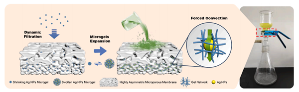 In this work, we report a novel and highly efficient catalytic membrane (PES/PNM-Ag) comprising welldispersed silver nanoparticles (NPs). The membrane can be straightforwardly constructed via dynamic loading expansible hybrid microgels PNM-Ag into a commercially-available poly(ether sulfone) (PES) membrane with asymmetric structure. Characterization results of PNM-Ag and PES/PNM-Ag indicate that a nanoscale three-dimensional network embedded with Ag NPs was developed in membrane pores by swollen microgels. The flat-sheet membrane reactor assembled with PES/PNM-Ag can efficiently and continuously catalyze the reduction of 4-nitrophenol (apparent reaction rate constant reaching 1.12 s-1 ) and showed good stability. The improved catalytic activity was attributed to fully accessible surface of Ag NPs as well as the unique structure of the membrane, in which the reactant was restricted to flow through immobilized catalyst. Present strategy hints to design other noble metal NPs loaded catalytic membranes for efficient conversion of nitro-aromatic pollutants.