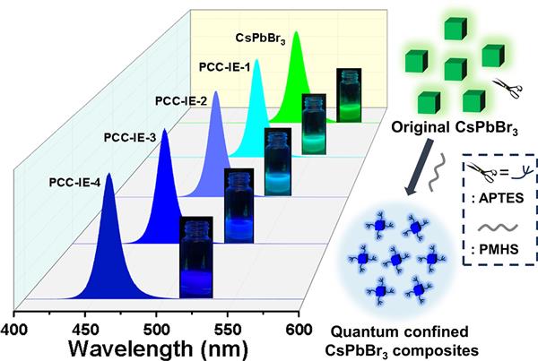 Quantum-confined CsPbBr3 nanocrystals are promising cyan/blue-emitting materials with exceptional potential for advanced lighting and display technologies. However, their practical application is often limited by low luminescent efficiency, undesirable color purity and instability stemming from inadequate size uniformity, and high surface defect density. Here, we propose a post-synthetic chemical cutting and in-situ encapsulation approach using 3-aminopropyltriethoxysilane (APTES) combined with polymethylhydrosiloxane (PMHS) to synthesize and stabilize CsPbBr3 nanocrystals with significant quantum confinement. APTES can function as a chemical scissor efficiently cutting the green emitting CsPbBr3 (9.8 nm) to smaller counterparts (3.9–7.9 nm), while also passivating surface defects through A-site doping. Crosslinking between APTES and PMHS prevents phase transformation during synthesis and forms a polymeric network that encapsulates and separates the quantum confined CsPbBr3. The resulting composites exhibit tunable emission from 517 to 461 nm, a narrow linewidth of approximately 15 nm, and quantum yields over 80%. Moreover, incorporating one CsPbBr3 composite into a white light-emitting diode to fill the “cyan gap” significantly enhances the color rendering index from 77.7 to 86.4. This work provides an effective strategy for developing bright and stable quantum-confined CsPbBr3 for advanced lighting applications.