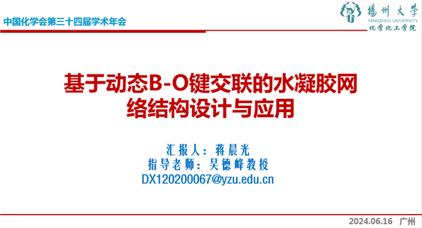 博士生蔣晨光同學做題為“基于動態B-O鍵交聯的水凝膠網絡結構設計與應用”的Flash報告~