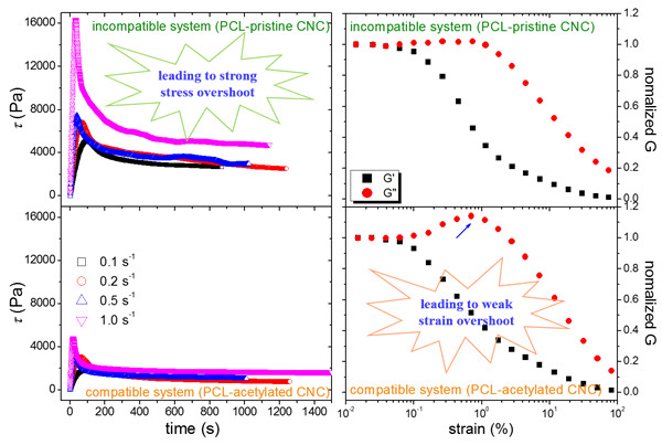 The pristine and acetylated cellulose nanocrystal (CNC) particles were incorporated with poly(ε-caprolactone) to prepare two kinds of green nanocomposite systems: the former is incompatible, while the latter compatible thermodynamically. A rheological study was then performed systematically with various flow fields, including linear and nonlinear dynamic shear flow, creep and start-up flow. Some interesting results were shown then. The pristine CNC filled system shows far lower percolation threshold than the acetylated CNC filled one because the improved phase affinity yields diluent effect. The formation and rebuild-up of percolated network is driven by the Brownian motion of particles, which are nearly independent of altered phase affinity. However, the improved phase affinity makes the system more sensitive to the strain-responded deformation, leading to the reinforced Maxwell spring unit during creep and to a weak strain overshoot during dynamic flow. The structural evolution and relaxations of two systems were further evaluated from different perspectives.