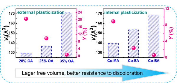 Lead-containing plexiglass is prepared successfully via copolymerization of lead-methacrylate (Pb(MAA)2 and the acrylic monomer such as methyl methacrylate (MMA), methyl acrylate (MA), ethyl acrylate (EA) and butyl acrylate (BA). The results show that as-prepared plexiglass has good photons shielding performance and resistance to the discoloration induced by radiation (10 kGy γ-ray), and the alteration of shielding performance can be well described by the Monte Carlo Code simulations (MCNP5). Using two plasticized systems, the external-plasticized one with various n-octanoic acid (OA) concentrations and the internal-plasticized one with different acrylic monomer, as the target samples, it is found that free volume plays dominant role in the irradiation resistance via the positron annihilation lifetime spectroscopy (PALS) and electron paramagnetic resonance (EPR) characterizations. The larger the free volume, the greater the quenching probability of free radicals during irradiation. Because the primary type of radiation-induced color centers are annealable color centers, the effect of annealing of irradiation-induced discoloration of lead-containing plexiglass is remarkable. Differing from common treatments of improving irradiation resistance, the increased free volume via plasticization gives plexiglass good resistance to discoloration. This study discloses valuable information around improving irradiation shielding performance and resistance to the radiation-induced discoloration for the plexiglass-based materials.
