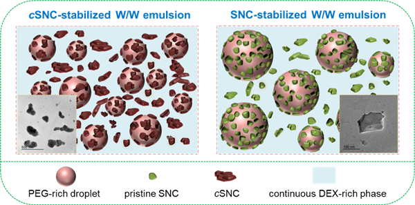 Experiments: Two surface modification strategies, crosslinking and acetylation, were applied to tune surface property and aggregation of SNCs, and a common all-aqueous system DEX/PEG was used here as template. The viscoelasticity and morphology of emulsions were studied in terms of the SNC loadings and polymer ratios.