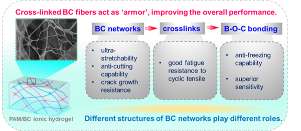 Cellulose nanofibers are one of the most frequently used filler for reinforcing hydrogels. The reinforcement, however, is commonly accompanied by the decrease of deformability. Inspired by the armor structured with overall flexible but locally rigid characteristics, we proposed a strategy of constructing chemical networks of bacterial cellulose (BC) in this work to improve the overall mechanical performance of hydrogels. The PAM hydrogels with borax-cross-linked BC nanofibers were prepared. The BC networks are multi-scaled, and different levels of structures play different roles. As the flexible networks, the cross-linked BC endows the hydrogels with superior stretchability (7,710%) and improves anti-cutting property as well as crack growth resistance. The crosslinks composed of boronic ester bonds act as ‘sacrificial bonds’, improving the fatigue resistance to the cyclic tensile with large strain (500%). The mechanical strengths of the hydrogels are also significantly enhanced due to the reinforcement role of BC nanofibers. Moreover, the remained sodium ions and borate ions give the hydrogels good conductivity and decreased freezing point. Accordingly, as-prepared flexible sensor has superior sensitivity (Gauge factor 10.1 for stretching) with satisfactory environmental adaptability. This work proposes an effective strategy of structural regulation for the cellulosic particle-containing hydrogel to improve the overall performance.
