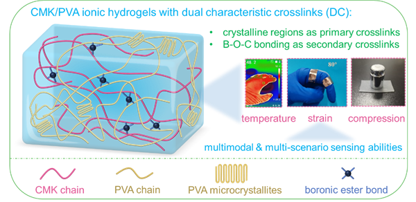 As the derivative of konjac glucomannan (KGM), carboxymethyl konjac glucomannan (CMK) has attracted increasing attention in the polysaccharide hydrogel fields with the aim of improving the performance related to drug delivery and release. In this study, we prepared a CMK-based hydrogel with dual characteristic crosslinks, and unlocked new applications of this type of hydrogel in soft sensor fields. CMK and poly(vinyl alcohol) were used as substrates, and physical crosslinks were constructed via the freeze-thawing treatments and covalent crosslinks were built via the boronic ester bonding. As-prepared hydrogel possessed significantly improved mechanical performance because the boronic ester bonding, on the one hand, well associated the two kinds of polymer chains, and on the other hand, played the role of ‘sacrificial crosslinks’. Furthermore, the occurrence of dynamic boronic ester bonding gave the hydrogel strain- and temperature-sensitive ionic conductivity, and therefore, the hydrogels could be used to identify human motions and as-resulted environmental temperature alterations, and worked well in various scenarios. This work activates new application of CMK in the multimodal sensing field, and also proposes an intriguing way of building multiple crosslinks in the KGM derivative-based hydrogels.