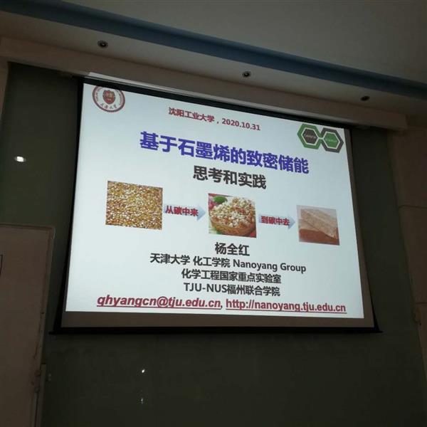 2020年10月31日,天津大學(xué)楊全紅教授應(yīng)邀來(lái)課題組指導(dǎo)工作并做了題為《基于石墨烯的致密儲(chǔ)能:思考與實(shí)踐》的學(xué)術(shù)報(bào)告,師生受益匪淺。