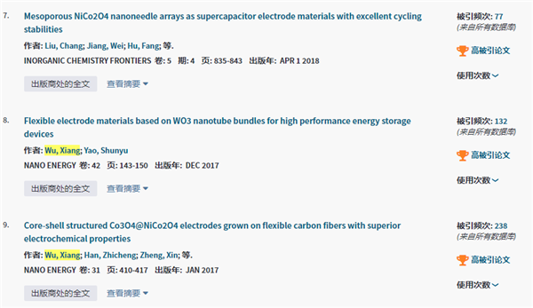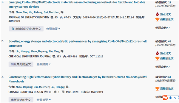課題組新增高被引論文2篇:Nano Energy 2017,42,143-150; New Journal of Chemistry 2018, 42, 7399 - 7406。熱點論文2篇:Chemical Engineering Journal 2019,373, 485-492;Journal of Energy Chemistry 2020,45, 67-73