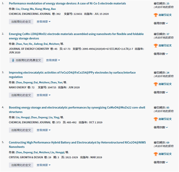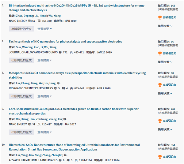 課題組高被引論文共13篇。減少3篇:Nano Energy 2017,42,143-150;CrystEngComm. 2011,13: 3506-3510;Applied Surface Science 2016,360,8-13