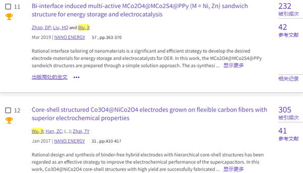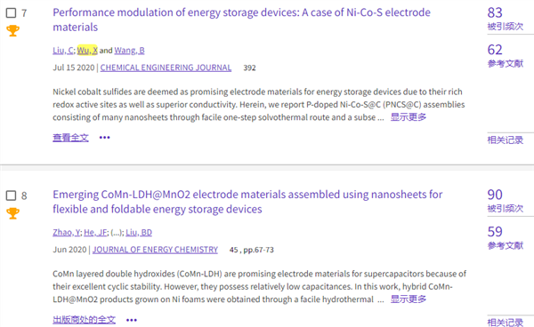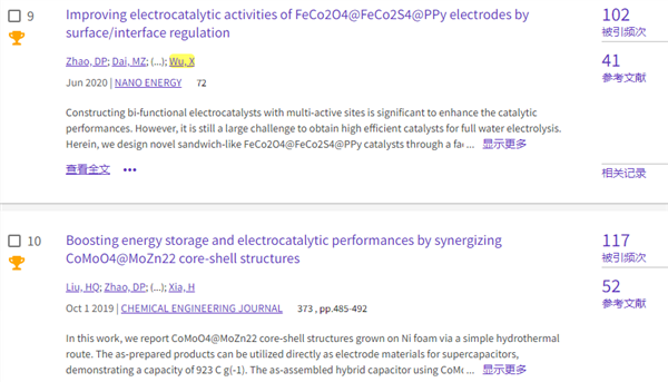 課題組先后有19篇論文入選高被引論文。減少7篇:Nano Energy 2017,42,143-150;CrystEngComm 2011,13: 3506-3510;Applied Surface Science 2016,360,8-13;New Journal of Chemistry 2018, 42, 7399 -7406;Journal of Alloys and Compounds 2019,772,465-471;Inorganic Chemistry Frontiers 2018, 5, 835 - 843;Crystal Growth & Design 2019,19,1921-1929。本次新增加兩篇(和7月相比):ACS Applied Materials & Interfaces 2022,14,11654-11662;Journal of Energy Chemistry 2022,69, 292-300。目前總數12篇。