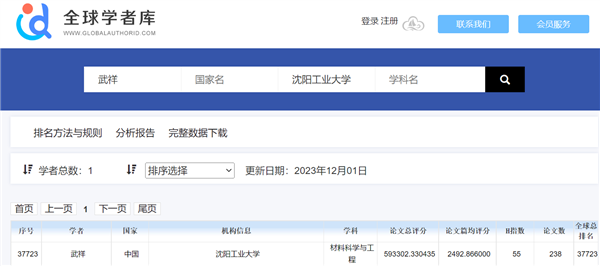 2023年12月1日,國內全球學者庫網站公布了“2023全球學者學術影響力排名(終身學術影響力榜)”,依照學者科研產出、Google Scholar Metrics 期刊評分、H指數、成果被引、成果中作者排序位置等參數綜合考慮的結果。平均分高表明學者更傾向于在高質量期刊發表文獻,綜合評分則更多考慮學者的產出量。中國共有8029人入圍,武祥教授位列全球37723位。