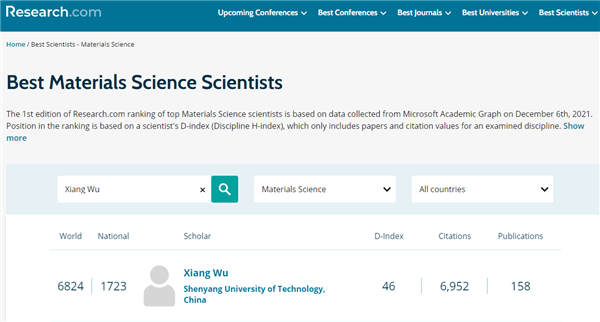 根據(jù)國際知名科技數(shù)據(jù)研究網(wǎng)站Research.com近期發(fā)布的世界最佳科學(xué)家排名 (https://research.com/scientists-rankings/best-scientists)。武祥教授在材料科學(xué)領(lǐng)域全球排名6824位,中國排名1723位。(https://research.com/scientists-rankings/materials-science)