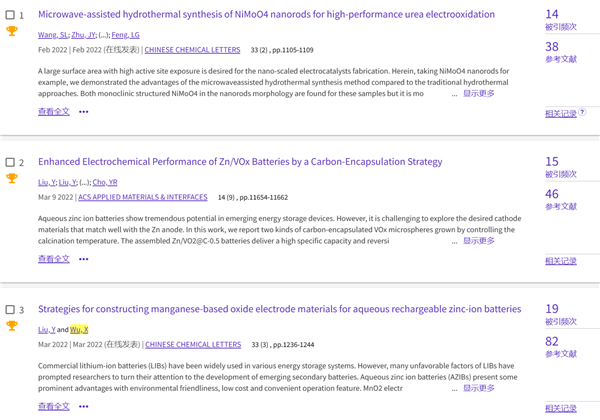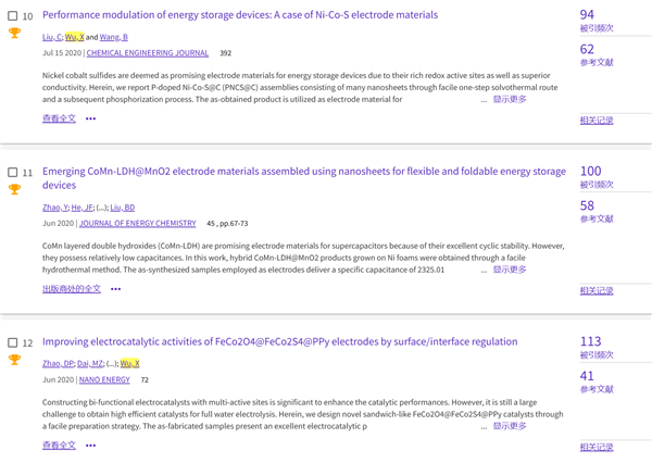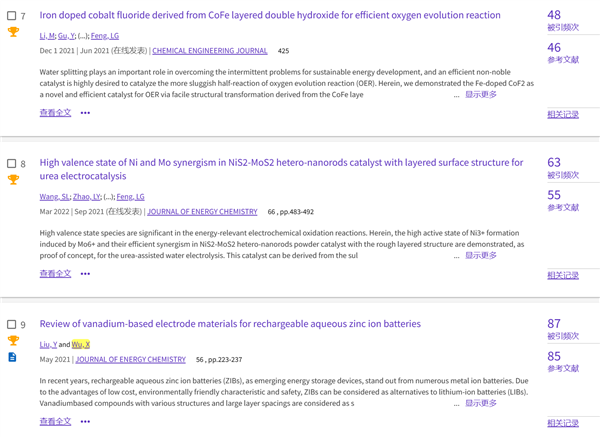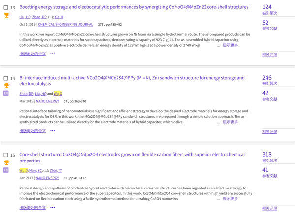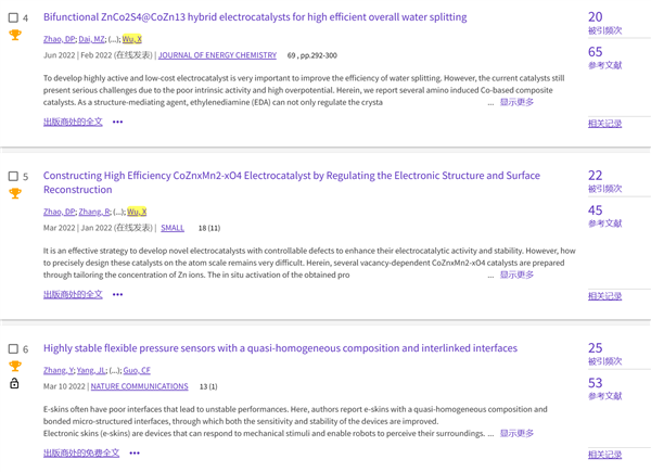 課題組先后有20篇論文入選高被引論文。減少8篇:Nano Energy 2017, 42,143-150;CrystEngComm 2011,13: 3506-3510;Applied Surface Science 2016, 360,8-13;New Journal of Chemistry 2018, 42, 7399 -7406;Journal of Alloys and Compounds 2019, 772, 465-471;Inorganic Chemistry Frontiers 2018, 5, 835-843;Crystal Growth & Design 2019,19,1921-1929;Nano Energy 2021,86,106124(本次減少)。另有4篇合作高被引論文。