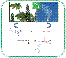 The selective copolymerization of CO2 and an epoxide to form fully alternating polycarbonates is a great challenge via catalysis with the zinc–cobalt(III) double metal cyanide complex [Zn–Co(III) DMCC]. We describe the first perfectly alternating copolymerization of CO2 with a bio-based epoxide. The resultant polycarbonate had a low Tgs of 38 to 44 C and two end hydroxyl groups, which were then used to initiate ring-opening polymerization of L-lactide via metal-free catalysis, affording a biodegradable triblock copolymer. This study provides a new platform copolymer for making various advanced polymers with biodegradable properties.