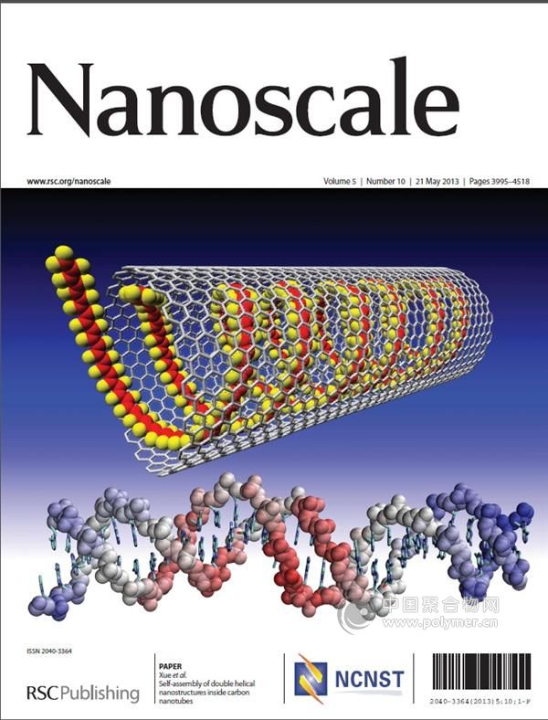 碩士研究生呂成在英國皇家化學學會期刊Nanoscale上發表“Self-assembly of double helical nanostructures inside carbon nanotubes(碳納米管中雙螺旋納米結構自組裝)”的封面論文(Nanoscale 2013, 5, 3995-3995, front Cover)。