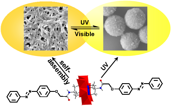 Smart POMs: A surfactant-encapsulated organic-grafted polyoxometalate (POM) is synthesized by grafting a photoresponsive azobenzene group to an Anderson-type POM cluster. Self-assemblies of the hybrid complexes exhibit photocontrolled reversible aggregation and morphological change as a result of photoisomerization-induced structural alternation (see figure).