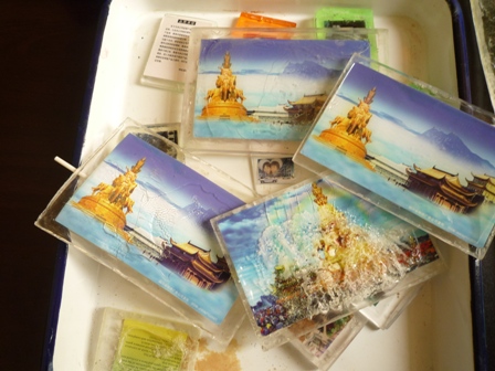 鑒于此,本項(xiàng)目首先采用本體鑄塑聚合法,將真空干燥器處理過的數(shù)碼照片內(nèi)嵌置預(yù)聚漿料中形成有別于一般沖洗店里的“水晶像”的密封式“亞克力影像”,本項(xiàng)目稱此“亞克力影像”為“仿水晶影像”或稱“亞克力仿水晶影像”。與此同時(shí),通過添加顏料或染料和光致發(fā)光粉還可以制作出彩色和發(fā)光“仿水晶影像”,使其擺在家里或辦公室中更加光彩奪目。