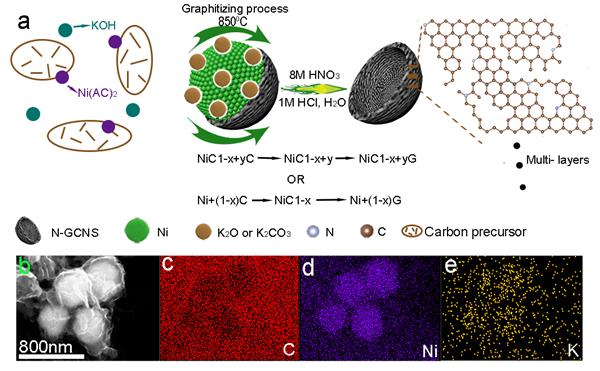 圖1. (a) N-GCNs的合成示意圖, (b-e) 未洗滌前N-GCNs的SEM圖及其Mapping圖。