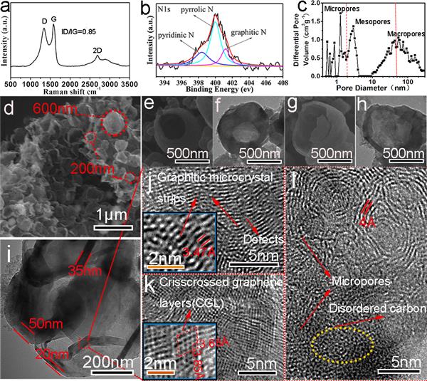 圖2.(a-c) N-GCNs的Raman, XPS (N1s)和孔徑分布圖,(d-i)N-GCNs的SEM, TEM,HR-TEM圖像