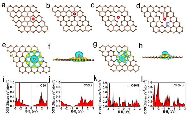 圖5.(a-d)PGs, NGs, DGs and NDGs 吸附鋰后的模型圖,(e,f)PGs 吸附鋰后的差分電荷圖,(g,h) NDGs吸附鋰后的差分電荷圖,(i,j)PGs吸附鋰前后的態(tài)密度圖,(k,l) NDGs吸附鋰前后的態(tài)密度圖
