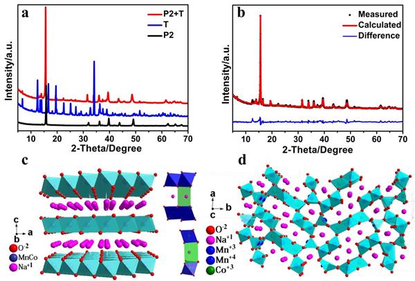 Figure 1.(a)P2-type Na0.7Co0.1Mn0.9O2, T-type Na0.44Co0.1Mn0.9O2 and P2+T-type NaxCo0.1Mn0.9O2的原始XRD曲線; (b) P2+T-type NaxCo0.1Mn0.9O2 Rietveld 精修結(jié)果曲線; (c)-(d) P2 相和 T 相材料結(jié)構(gòu)模型圖.