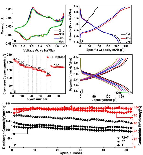 Figure 3(a)在1.5-4.4V的電位范圍內(nèi),0.1mVs-1掃速下P2+T NaxMn0.9Co0.1O2的循環(huán)伏安圖,(b)P2 + T型材料在1.5到4.4V之間的充電/放電電壓曲線;(c)P2 + T型材料的倍率性能(1C對應(yīng)于176mAg -1);(d)P2 + T型材料在1C倍率下5圈,10圈,20圈,30圈,40圈和50圈循環(huán)的充放電曲線(e)在1.5-4.4V電壓范圍內(nèi)三種材料的循環(huán)對比圖