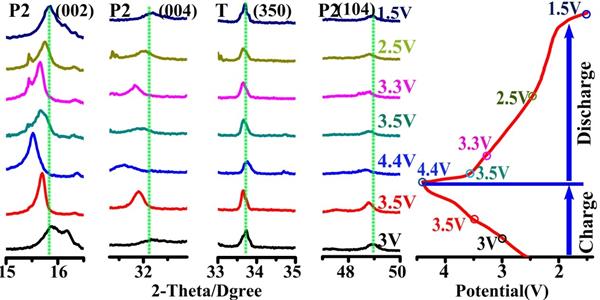Figure6 1.5-4.4V的電勢范圍內(nèi)以0.1C下在P2+T材料的充電/放電期間收集的非原位XRD圖