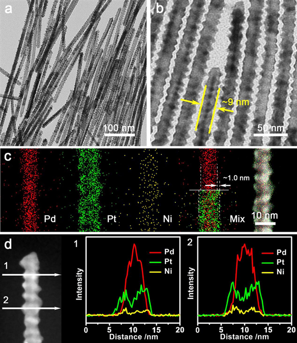 圖1. Pd@PtNi-NWs的結(jié)構(gòu)和成分分析。a,b) Pd@PtNi納米線的TEM圖, c)單根Pd@PtNi納米線的能譜元素映射圖和局部對應的HAADF-STEM圖,d)使用STEM-EDS(沿白色箭頭)進行線掃描分析可清晰呈現(xiàn)出納米線的核殼結(jié)構(gòu)及元素分布情況。