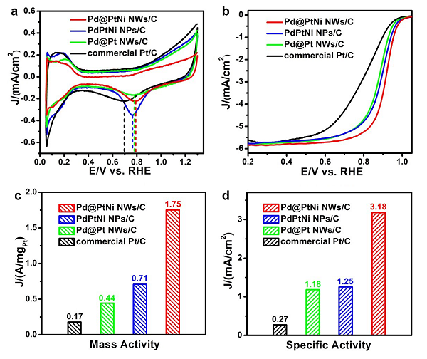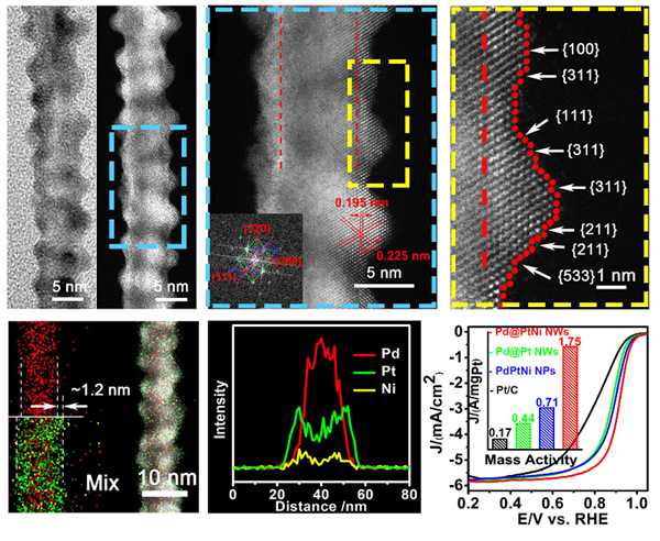 在催化氧還原反應酸性介質(zhì)中對比商業(yè)碳載鉑及其他類似鉑基材料表現(xiàn)出明顯優(yōu)勢: 此納米線催化氧還原反應的質(zhì)量比活性是商業(yè)碳載鉑催化劑(0.17 A mgpt-1)的10倍,比活性是商業(yè)碳載鉑催化劑(0.27 mA cm-2)的12倍。Pd@PtNi-NWs獨特的納米結(jié)構(gòu):高指數(shù)PtNi合金外殼與一維核殼線性結(jié)構(gòu)的巧妙組合能夠有效地提高催化氧還原反應的活性及穩(wěn)定性。