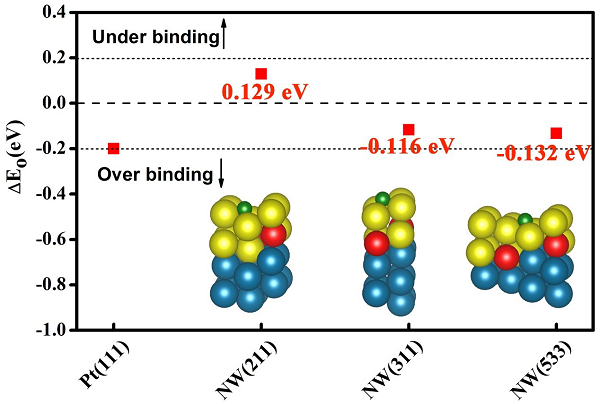圖6. 利用密度泛函理論計算了Pd@PtNi核殼結(jié)構(gòu)納米線表面的氧吸附能(E0)