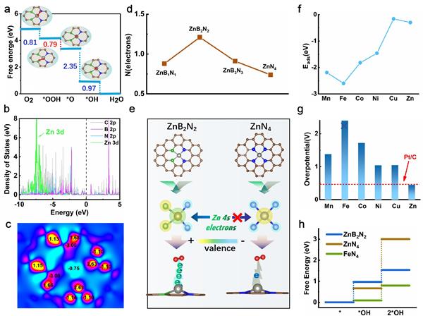 Bader電荷和EPR測試結果同時證明了Zn+的存在,這與XANES分析Zn0和ZnII之間的混合價態一致。研究發現,與其它過渡金屬相比(N2-M-B2,M=Mn,Fe,Co,Ni,Cu),N2-Zn-B2具有適度的中間體吸附能和最低的過電勢,而其穩定性優勢在于形成*Zn(OH)中間體所需的自由能最高,并且向*Zn(OH)2的轉化要比鐵的腐蝕困難得多。