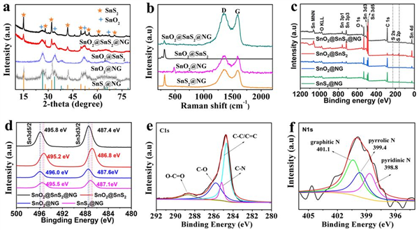 接著,作者對SnO2@SnS2@NG復(fù)合電極材料進行了結(jié)構(gòu)表征(圖3)。SEM和TEM圖表明大量SnO2@SnS2異質(zhì)結(jié)構(gòu)量子點在石墨烯片層中分布非常均勻。HRTEM和SAED圖表明SnO2和SnS2存在異質(zhì)界面并與石墨烯接觸較為緊密。此外作者還通過XRD、Raman、XPS對所合成電極材料進行了定性和元素分析(圖4)。XRD測試結(jié)果表明所合成樣品的圖譜中可以明顯地檢索到SnS2(JPCD No. 23-0677)和SnO2(JPCD No. 41-1455)晶體結(jié)構(gòu)的衍射峰。同時Raman圖譜中D(~1350cm-1)和G(~1580cm-1)峰的存在也證明了NG的存在。XPS測試也證明了C、N、Sn、S、O相關(guān)元素的存在,并且相比于SnO2@NG和SnS2@NG,Sn 3d和S 2p峰位的偏移也可能是由于SnO2和SnS2之間存在異質(zhì)界面造成的。