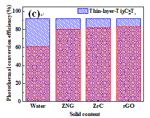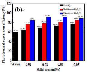 由圖4可知Ti3C2Tx -H2O具有較高的光熱轉化性能,當質量分數為0.02%的時,最大光熱轉化效率達到了91.9%,高于我們團隊之前制備的具有較好光熱轉化效果的光熱功材料。