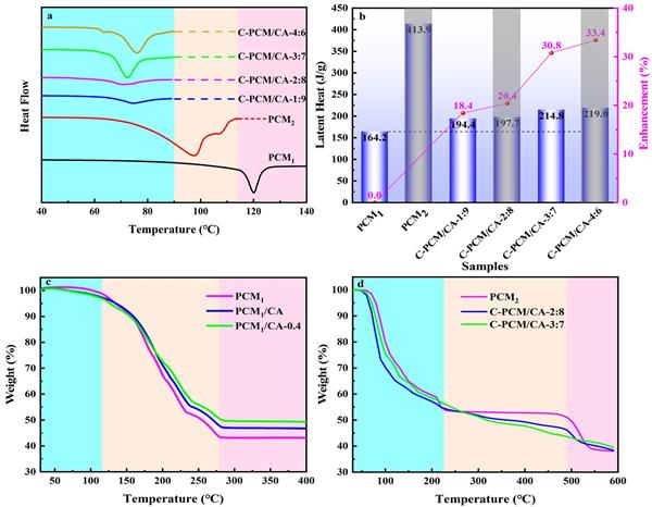 本研究以殼聚糖基碳氣凝膠為支撐材料,將共晶MgCl2?6H2O和NH4Al(SO4)2?12H2O為相變材料,構建了一種有效太陽能儲能的共晶C-PCM/CA,儲能密度可達214.8 J/g,比純MgCl2?6H2O提高30.8%。此外,基于碳納米材料和ZrC材料的協同光能吸收作用,共晶相變材料可以有效地捕獲太陽能,表現出良好的光熱轉換效率(89.5%)。構建共晶后,腐蝕分子減少流動擴散,有效緩解了腐蝕效應,同時冷卻過程中水合鹽的過冷問題得到解決。經多次試驗,所制備的共晶C-PCM/CA表現出良好的熱循環穩定性,為集成實用的太陽能儲能和緩蝕效應提供了一種有前景的策略。